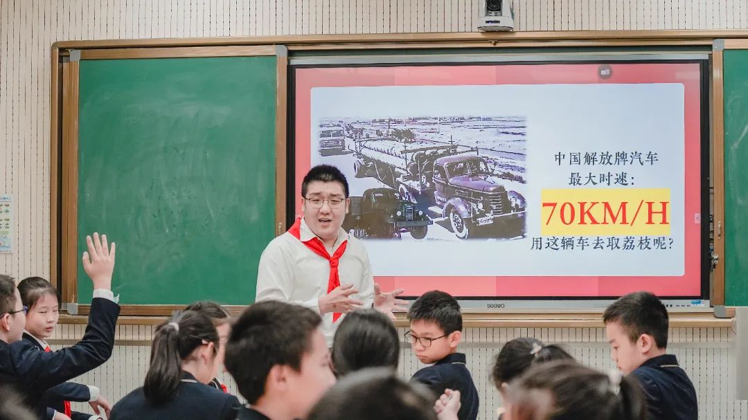 “一骑红尘妃子笑,无人知是荔枝来。”当天,秦楠以杜牧的名诗《过华清宫绝句》作为开场,引领学生们一步步探索自唐朝以来荔枝运输时间的衍变。“一千多年前,荔枝通过骑马运至长安,需要不眠不休跑30-40天。中华人民共和国成立后,解放牌汽车问世,用这辆车运输荔枝,需要花费8-9天。”通过计算和比对,秦楠带着学生们得出了这一结论。