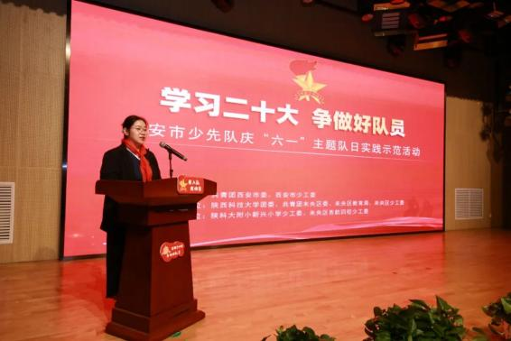 2023年5月30日上午,团市委、市少工委在陕西科技大学举办“学习二十大•争做好队员”西安市少先队庆“六一”主题队日实践示范活动。团市委书记徐辉,陕科大副校长李学军,团市委副书记、市少工委主任尤婷,学校少工委负责人、少先队辅导员、少先队员、一年级学生和家长代表共计100余人参加本次活动。