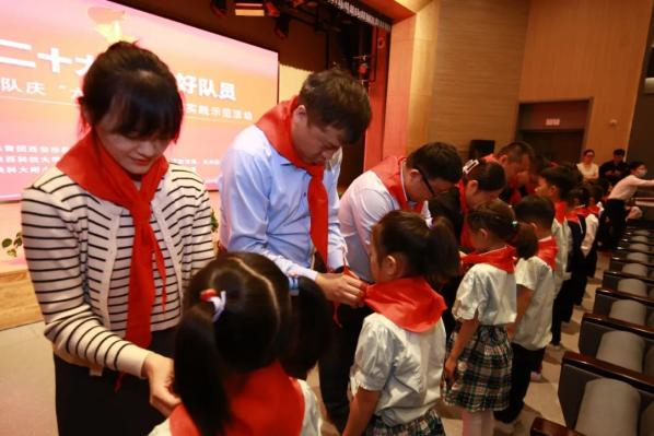 在宣读完新队员的入队决定后,参加本次活动的来宾、辅导员老师、优秀共青团员、少先队员们为新队员佩戴红领巾。
