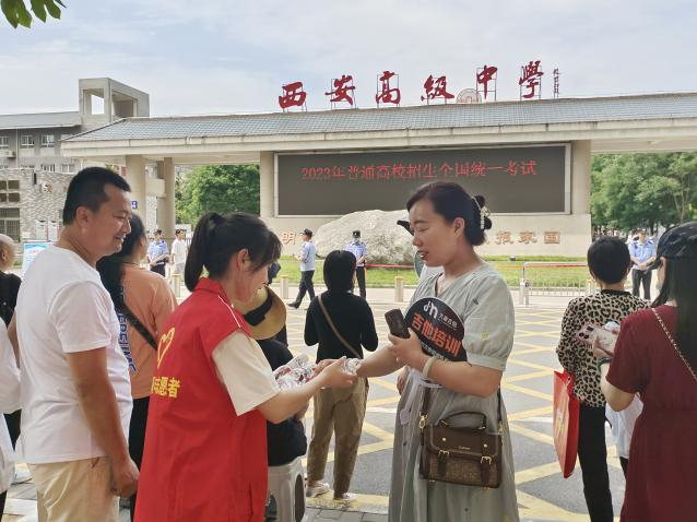 十年寒窗苦读,学子圆梦今朝。2023年6月7— 8日高考期间,由共青团西安市委、西安市教育局、西安市城市管理和综合执法局主办的“为高考护航 为青春喝彩”爱心助高考送水志愿服务活动,在新城区、碑林区、莲湖区、雁塔区、未央区的21个高考考场外开展,青年志愿者为考生及家长免费提供饮用水及相关助考服务,为保障高考顺利进行贡献青春力量。