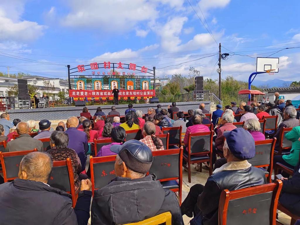 蓝田县厚镇东咀村,全村共有8个村民小组,309户1037人,留守在家的基本上是60岁以上老人。“今年是团市委、机关工委对口蓝田县厚镇东咀村乡村振兴工作的第三年。恰逢重阳节,我们发现全村有留守老人居多,就决定请戏剧演员进村演出。”团市委对口蓝田县东咀村驻村工作队队员刘建设介绍。
