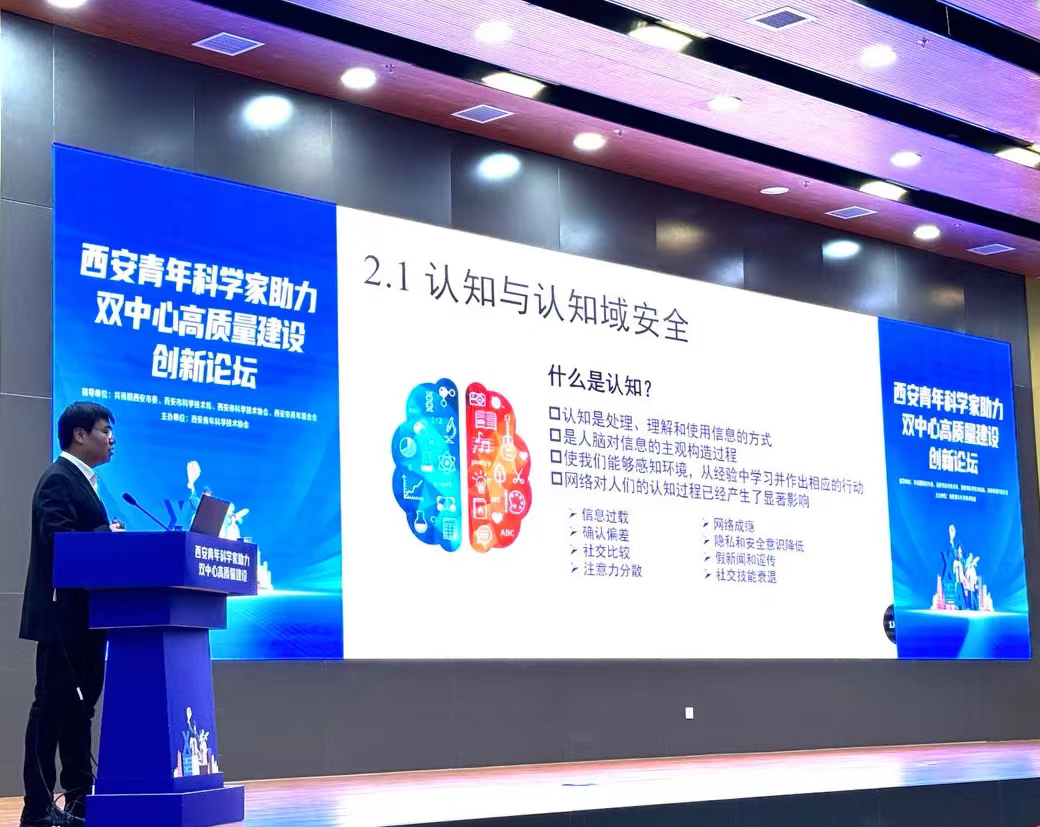 主题报告环节,首先由市青科协主席、 西工大教授、欧洲科学院院士王震作了题为《AI驱动的网络空间智能对抗》的报告,他表示,网络空间已成为继陆、海、空、天四个疆域之后的第五疆域,以信息环境为载体的网络空间正面临着来自于以现实实体世界为核心的物理信息域、以数据通信为重心的网络域、以人为中心的认知域的安全风险挑战。