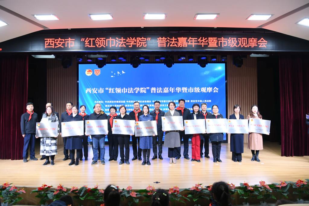 仪式上,与会领导共同为第五批市级“红领巾法学院”命名学校代表授牌。本次活动,由市委政法委、市委社会治理办、市委文明办、共青团西安市委、市中级人民法院、市人民检察院、市司法局、市教育局、市关工委、市少工委主办,新城区委政法委、区委依法治区办、区委社会治理办、区委文明办、团新城区委、区人民法院、区人民检察院、区司法局、区教育局、区文旅体局、区禁毒办、区关工委、区少工委,韩森寨街道党工委协办,西安市第三十八中学、新城区东方小学共同承办。