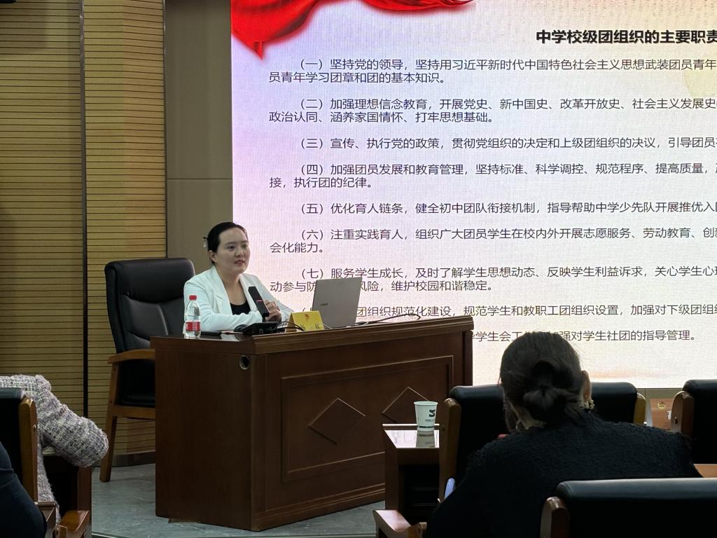 陕西省经济学学会理事、西安市委党校经济学教研部副教授、西安市致公党特聘专家丁亮,西安市青年讲师团讲师、西安市树梦家庭教育讲堂负责人、西安新东方家庭教育中心主任李昭萌,西安市铁一中学团委书记翟清晨和西安市临潼区华清中学团委书记杨欣分别围绕《学习贯彻习近平总书记来陕重要讲话精神 谱写中国式现代化西安新篇章》《青少年心理健康与沟通技巧》《中学共青团活动的设计与开展》和《中学学校团组织年度特色工作》进行专题辅导讲座和工作经验交流。