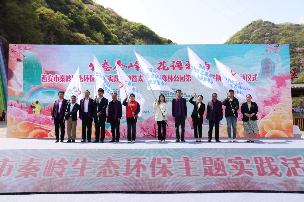启动仪式现场,与会领导为西安市秦岭生态环保青年志愿服务队、西安培华学院秦岭生态环保志愿服务队、西安明德理工学院秦岭生态环保志愿服务队、鄠邑区志愿者联合会志愿服务队、长安区青年志愿者协会志愿服务队、太平国家森林公园志愿服务队6支队伍授旗,秦岭保护青年志愿者代表发出倡议,要做秦岭生态环保志愿服务行动的宣传者、践行者和守护者,将“奉献 友爱 互助 进步”的志愿精神注入秦岭保护的火热实践中,让秦岭美景永驻、青山常在、绿水长流,为美丽生态西安建设贡献青春和力量。