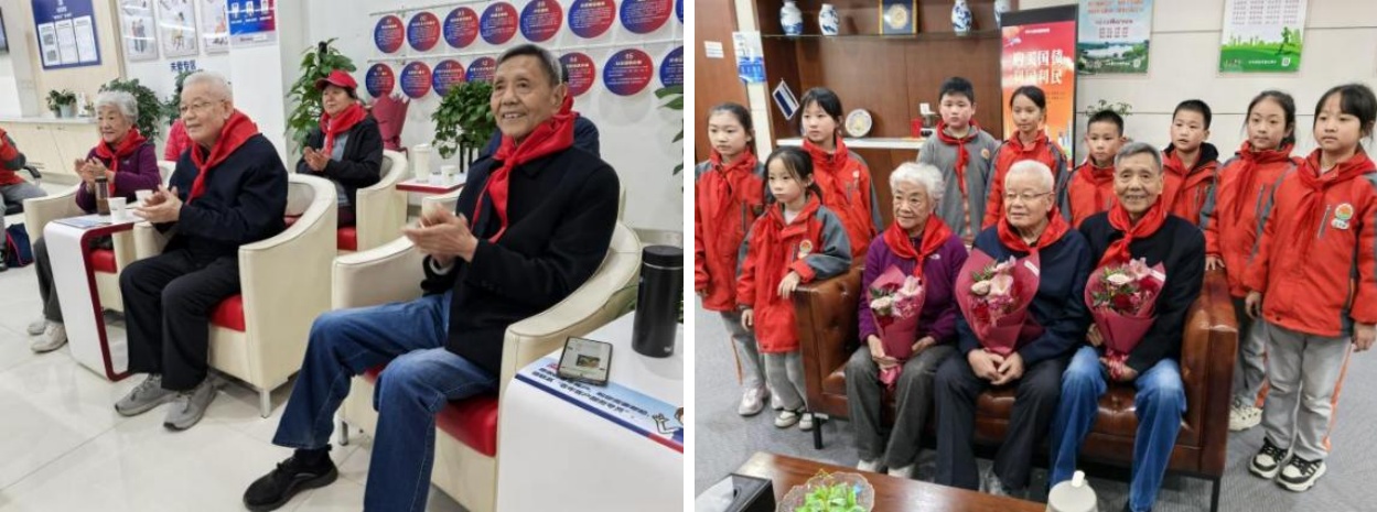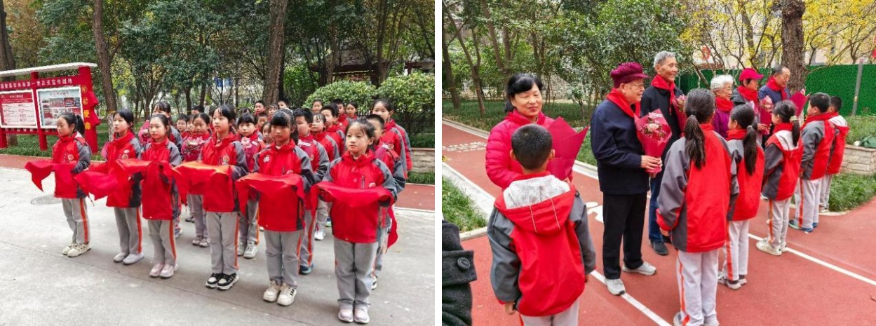 活动在庄严而温馨的氛围中拉开帷幕。当精神矍铄的黄跃添爷爷出现在大家面前时,全体少先队员肃然起敬。两名“小葵花”代表迈着整齐的步伐走上前,郑重地为爷爷佩戴上鲜艳的红领巾。