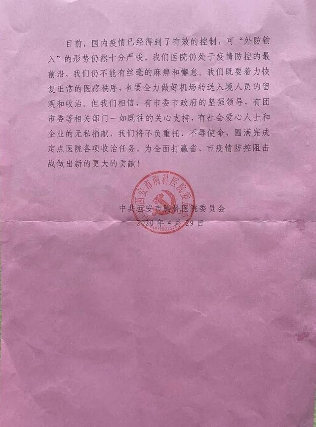 近日,团市委收到了西安市胸科医院的“感谢信”,表达了团市委在疫情期间对胸科医院家属的关怀与支持。