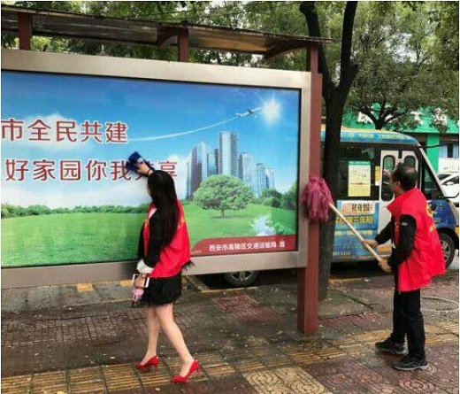 地面上落叶杂乱一地、城区内广告牌上点点污泥、垃圾箱上灰尘堆积,志愿者手持扫帚、簸箕将路面打扫干净,用拖布、抹布擦拭掉污泥和灰尘。