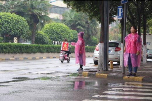 12点左右,志愿服务队走上了街头开始了志愿活动,尽管下着雨,空气中弥漫着些许寒意,但是我们的志愿者依然热情高涨,积极投入到活动中去。活动现场,志愿者手持引导牌,身穿志愿者服装,对行人闯红灯、不走斑马线等行为进行文明劝导,不仅及时制止了一些市民不文明的交通行为,并帮助有困难的市民安全过马路。