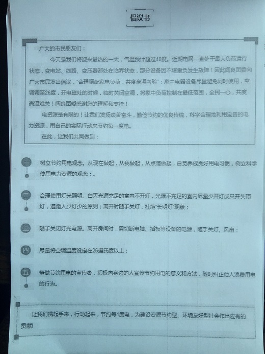 近期40多度的高温一直肆虐着,人们都不想离开空调房半步,正式由于高温,人们大量用电,导致电网一直处于最大负荷运行状态,部分设备因不堪重负发生故障!所以,阎良团委面向广大市民发出倡议: