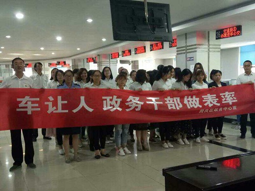中心全体干部在“车让人-政务干部做表率”横幅上郑重签名。