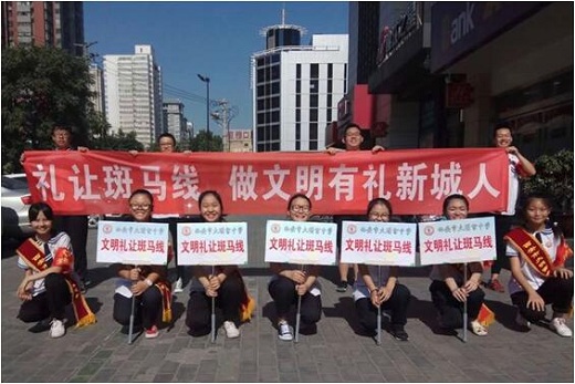 7月14日,新城区大明宫中学积极响应关于"车让人"活动的号召,校团委组织学生到新城区自强东路进行"文明礼让斑马线"青年志愿者活动。