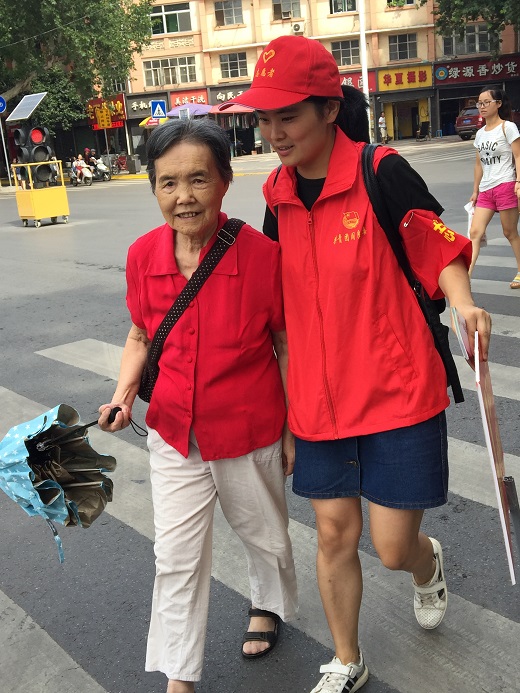 志愿者身穿红马甲,佩戴小红帽,手持“车让行人 青春践行”的手势牌认认真真的做好志愿工作。红灯亮起,志愿者们组织大家站在路两侧的安全位置等待;绿灯亮起,志愿者们先用手势牌提醒司机停车等待,然后把行人送到路对面,遇到上年纪腿脚不便的行人,志愿者们主动上前搀扶他们,把他们安全护送至路对面。