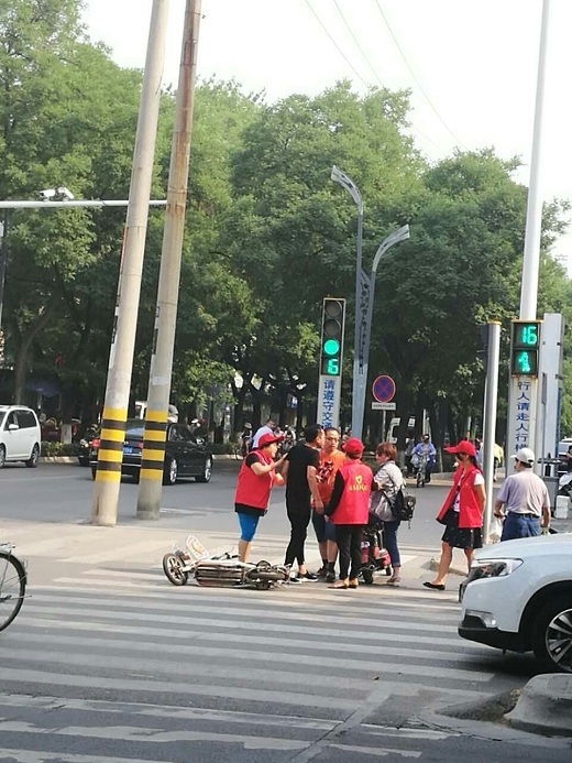 在开展活动过程中,我们还遇到了一起交通事故,两辆电动自行车发生剐蹭,从而引发纠纷,志愿者们和交警一起对双方进行劝导,最后双发握手言和,各自上班去了。