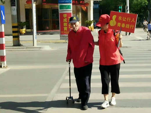 志愿者们手举“点赞”牌进行“车让人”文明引导,带领年老体弱群众一起过马路,并为文明礼让司机进行交通提示和点赞。