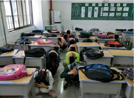 随着“演练开始”的广播口令响起,学生迅速蹲下,躲在课桌旁,并用书包或书本保护头部。约1分钟后,“紧急疏散”口令响起,各班学生在教师指导下快速、有序疏散到指定的“安全地带”,整个疏散过程共用时3分28秒钟。
