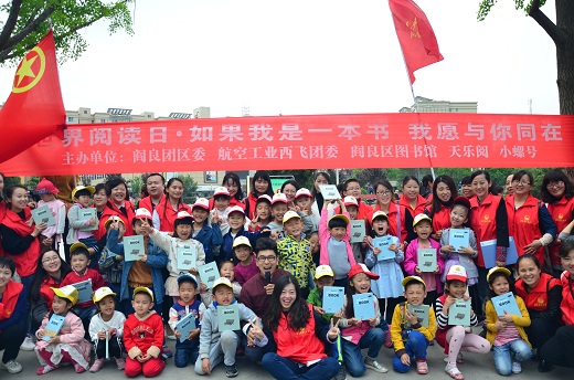 4·23世界读书日,阎良团区委、航空工业西飞团委、阎良区图书馆、天乐阅家庭绘本馆、小螺号舞蹈培训中心在千禧广场共同推出了“如果我是一本书,我愿与你同在”朗读快闪活动。