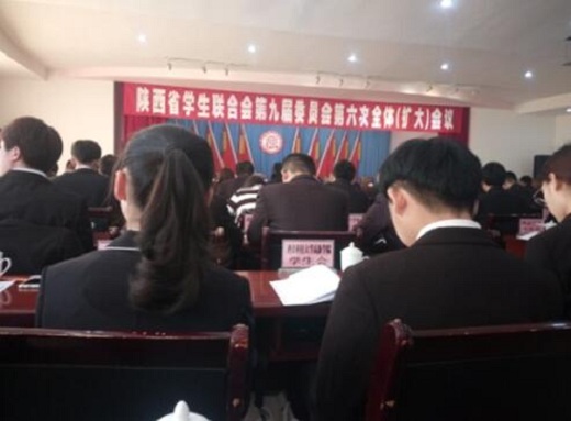 2017年3月4日,我校学生会受省学联邀请,参加第九届委员会第六次全体(扩大)会议。会议听取了第九届第四任学联主席陈怀详做工作报告。报告向全省广大青年学生发出追赶超越的青春倡议;团省委徐副书记作重要讲话,激励青年学生胸有情怀,把握机遇;各大高校学生会、研究生会分组研讨学联未来工作,思想碰撞火花。会议紧扣为学生服务的工作出发点,并投票选举产生第九届第五任陕西省学生联合会主席,新任主席臧彦铭做了表态发言。