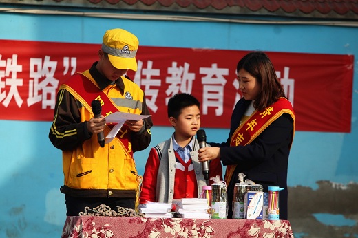 活动中青年志愿者在西安沣东新城阿房路一校为学生发放铁路安全知识宣传单,为学生讲解“爱路护路”宣传漫画。