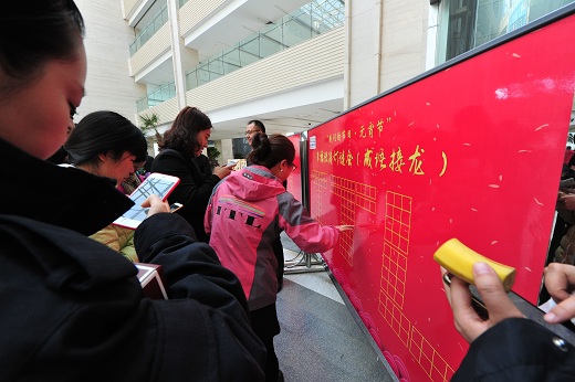 2月9日中午,活动刚一启动,广大干部员工就聚集而来,活动现场张灯结彩、热闹非凡,现场一边是精心准备的猜灯谜活动,谜面妙趣横生,谜底包罗万象,广大职工及群众有的苦思冥想,有的交头接耳,好不热闹;一边是成语接龙活动,现场,时而妙语连珠,笑声一片,时而静静思索,鸦雀无声。