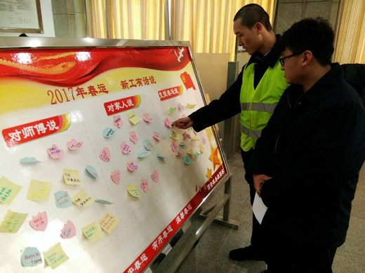 此次活动分为对师傅说、对家人说、对支援春运说,充分掌握新工面对首次春运的心理,通过说出新工自己的心里话,从而带动新工参与春运的热情。