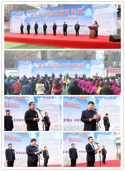 活动中,区教育局领导致辞并向全区各校(园)长、教师、学生、家长以及市民朋友们发出倡议,随后,校长志愿者代表和学生志愿者代表分别作了表态发言,参会人员共同在“烟头不落地西安更美丽”主题背板上郑重签名,王岩副区长代表区委、区政府做了重要讲话。现场活动结束后,全体参会人员分组走上街头、深入附近社区,捡拾烟头和垃圾,提醒引导市民不乱扔垃圾,积极为维护城市环境贡献力量。