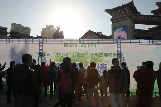 1月12日下午,市治污减霾办、莲湖区委、区政府联合环保莲湖分局、团区委等八部门,在大唐西市广场共同举办了“我带头、我行动、我健康,不燃放烟花爆竹”倡议宣传活动,并采用有奖问答的形式,向市民发放地铁卡300张。