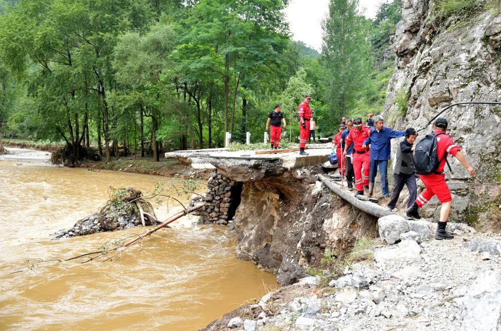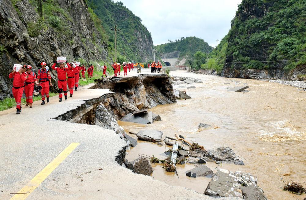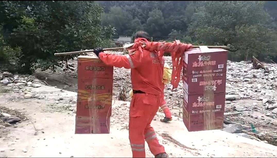 冰冷的雨水无法浇灭志愿者们心中的热情,毁坏的道路无法阻拦志愿者们奔向需要帮助的人民。洪水造成洛南县公路损毁严重,有些路段甚至只容一人侧身而过,志愿者们肩挑背抗,不畏艰险,在满是石块的河道和泥泞不堪的道路上徒步几十公里,将维系居民生活的物资送到他们手上。