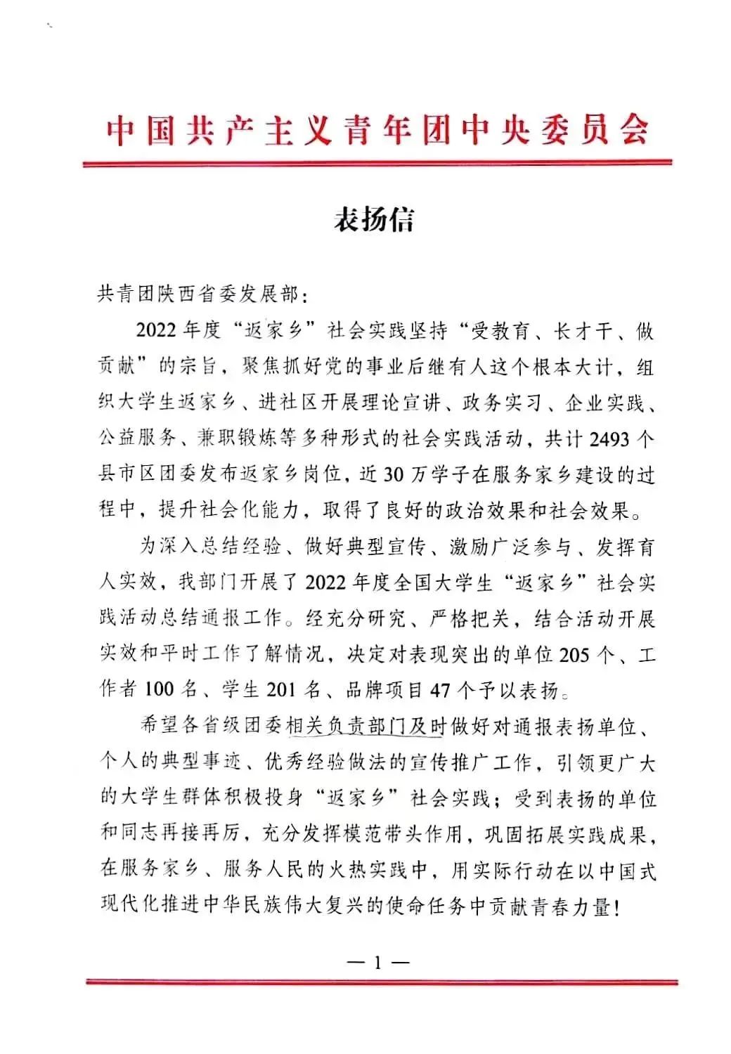 近日,共青团中央对2022年度全国大学生“返家乡”社会实践活动进行了总结通报,对表现突出的单位、工作者、“返家乡”大学生和品牌项目予以表扬,其中我市荣获两项荣誉:共青团西安市蓝田县委获“2022年度全国大学生‘返家乡’社会实践活动表扬单位”,由共青团西安市蓝田县委推荐的西安翻译学院2020级本科生张子怡获“2022年度全国大学生‘返家乡’社会实践活动表扬学生”。