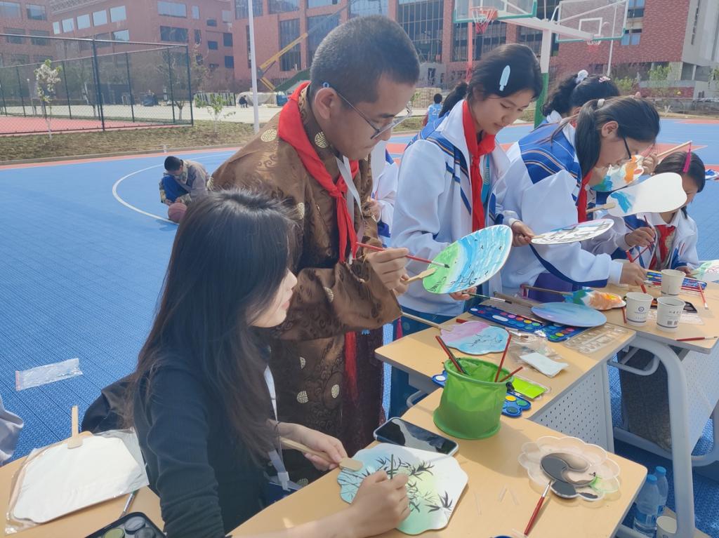在校园的另一侧,“小葵花”们在西京学院大哥哥大姐姐的带领下,开展了绘画写生及手工制作,通过画笔和巧手将民族团结一家亲定格在纸扇上。在多样有趣的活动中,增加了陕藏青少年之间的交融、交流、交往,促进了民族间的手拉手、心连心。