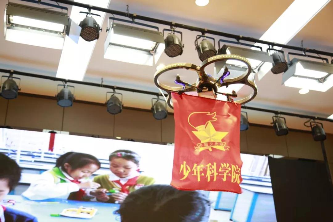 舞台中央,由红领巾少年科学院柏景森老师操纵的无人机缓缓升起,象征着新时代中国科技事业发展将迈向更高水平,在党的领导及少先队的带领下,少先队员们的科技梦在新时代将更好绽放。