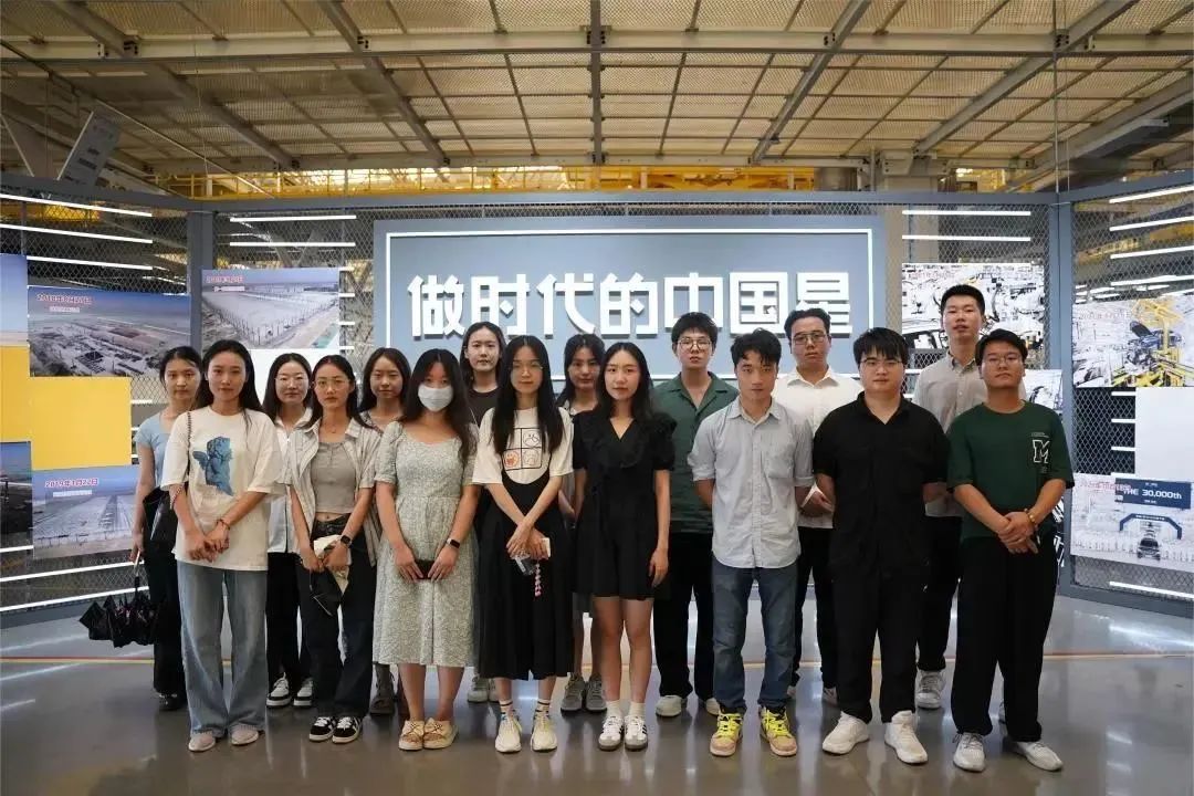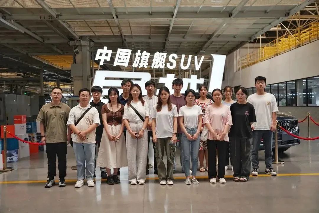 最后,见习大学生们来到吉利汽车集团有限公司。在工作人员的带领下,学生们走入采用先进技术的冲压车间,映入眼帘的是智能机器人、全时实时监控、“运输连廊”等智能化生产设备,学生们无不为之感到震撼;来到全自动化操作的焊装车间,一排排工业机器人正进行着精准焊接,火花四溅,工业之美展现的淋漓尽致;进入到无人喷涂的涂装车间,现代工艺的精妙绝伦令人折服;在集数字化、自动化、智能化、柔性化为一体的总装车间,学生们切身感受了整车下线的壮观场面,领略了现代化数字工厂的魅力,亲身感受到了我国在自主研发领域取得的突破性进展。