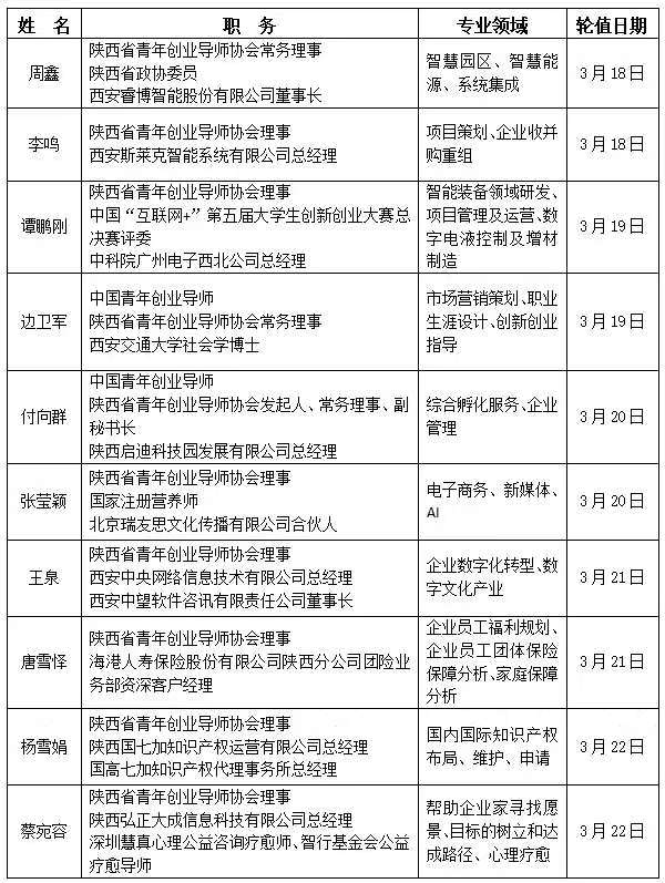 本周创业导师门诊值班表