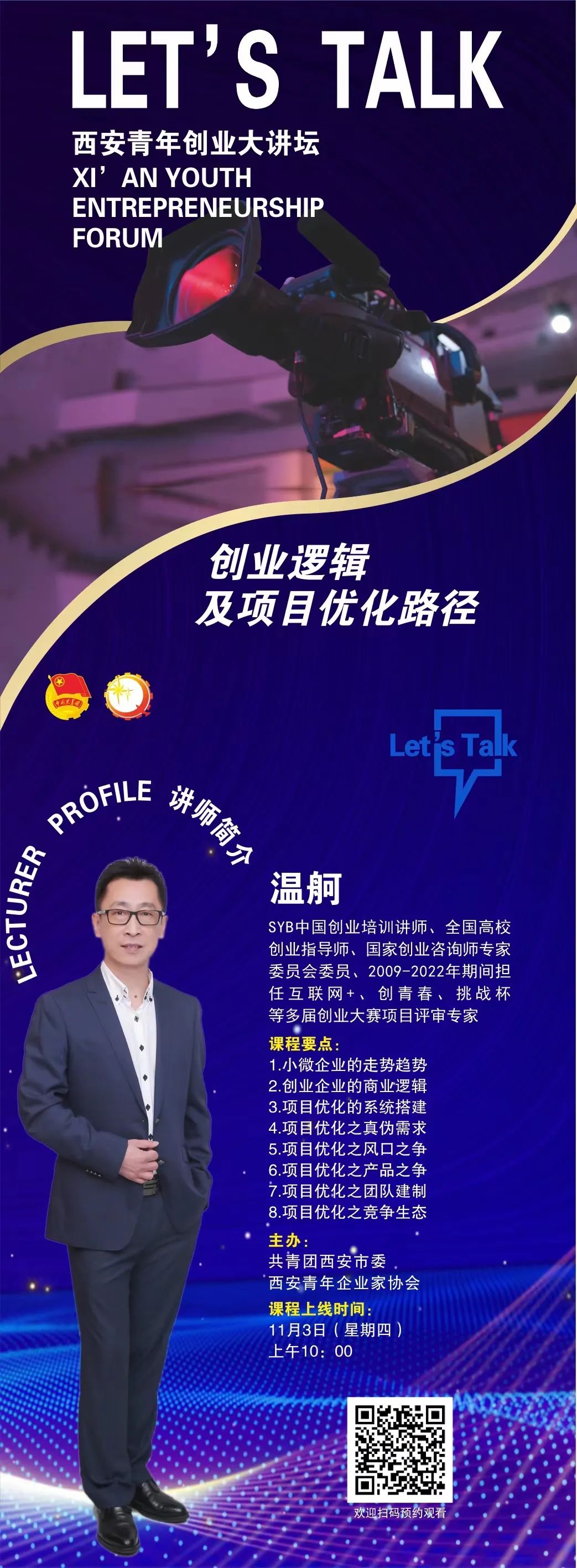 西安青年创业大讲坛 | 开讲预告:创业逻辑及项目优化路径(长期可扫码观看)